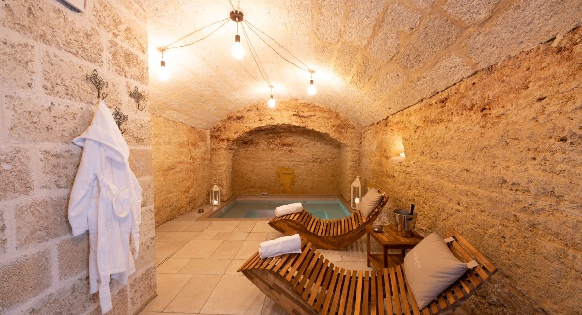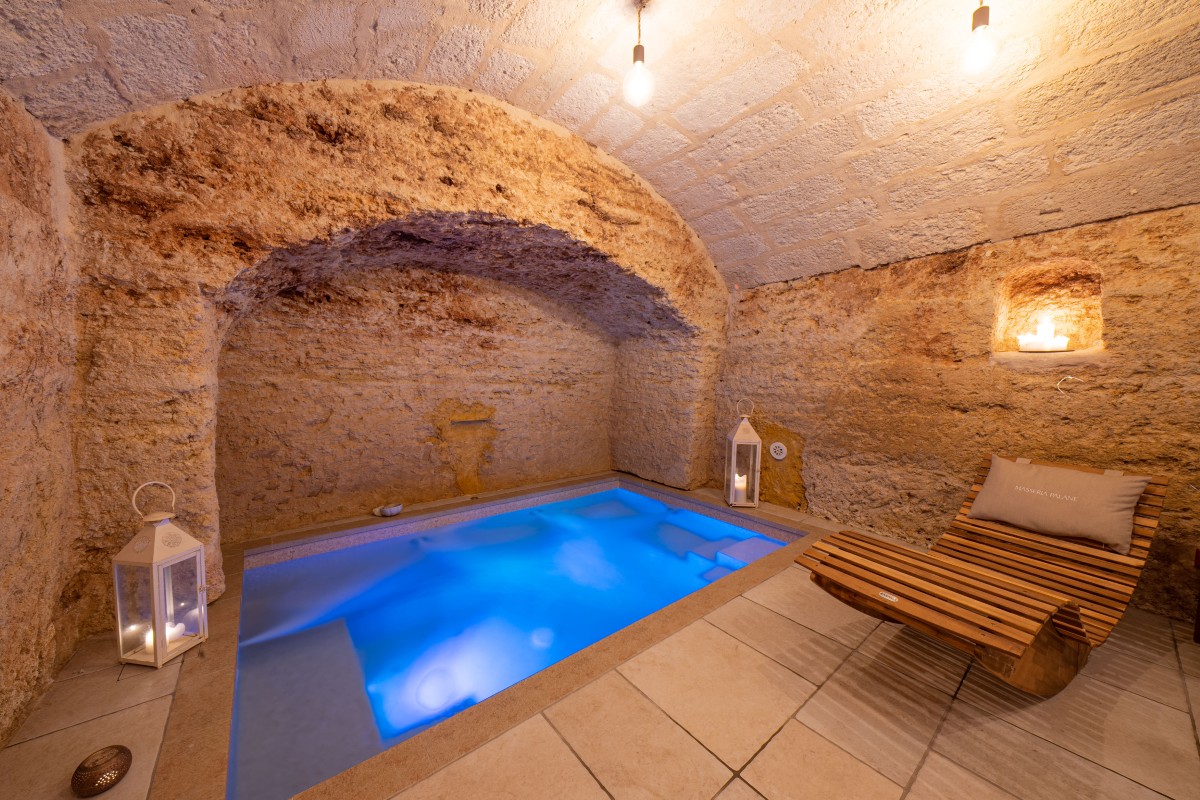 All’interno di Masseria Palane, trovi la nostra Area Wellness Ipogea, disponibile tutto l’anno, un posto unico dove riappropriarsi del proprio tempo, armonizzare i sensi e ritrovare se stessi con la dolcezza della piscina riscaldata, naturalmente salata, scavata nella roccia, dotata di idromassaggio e lama cervicale.